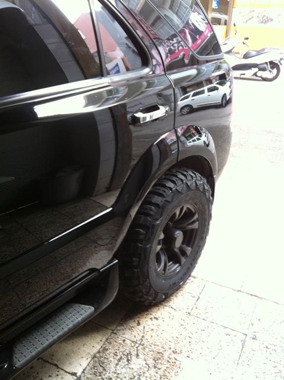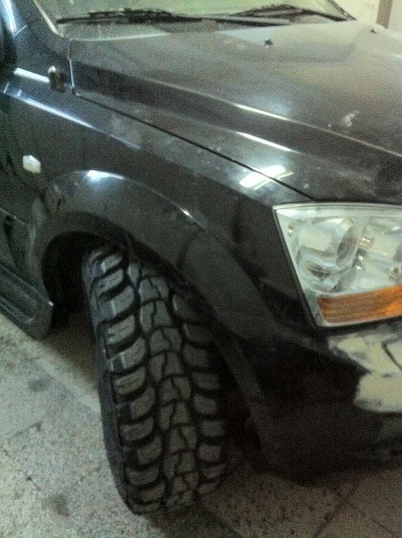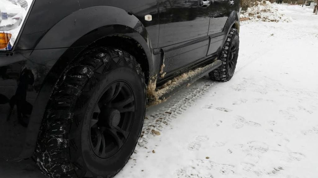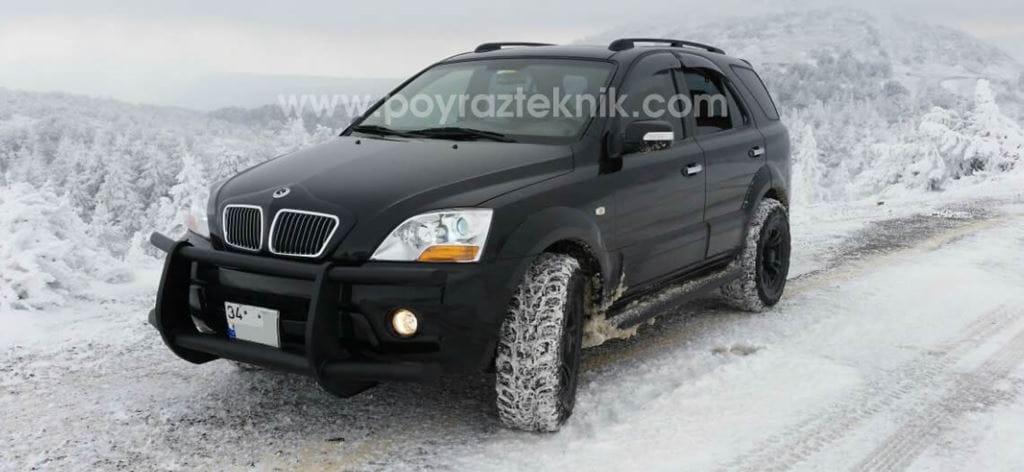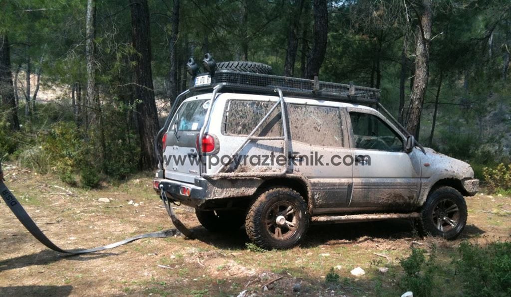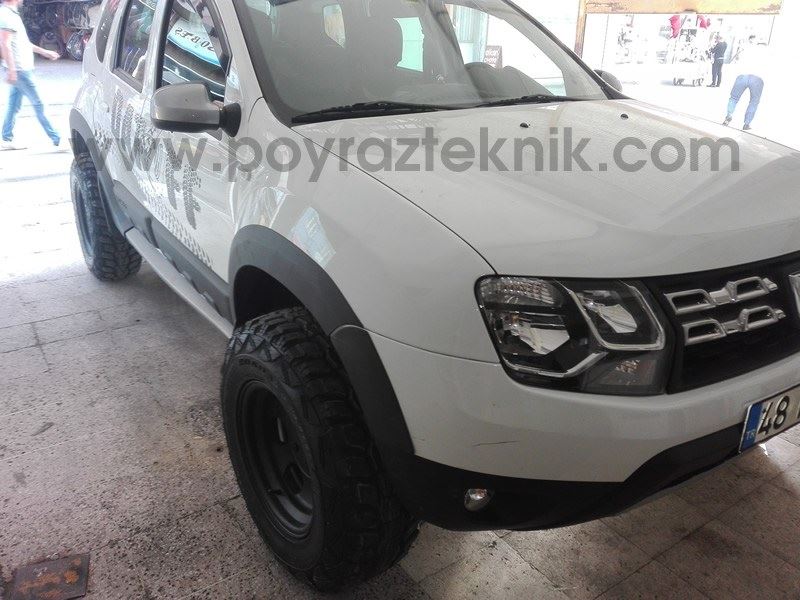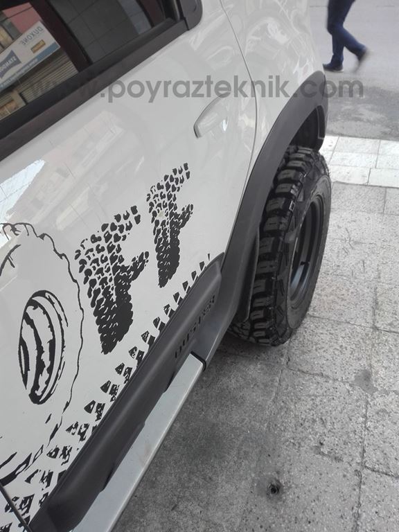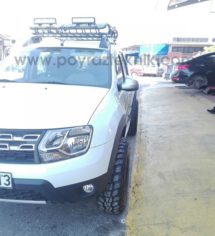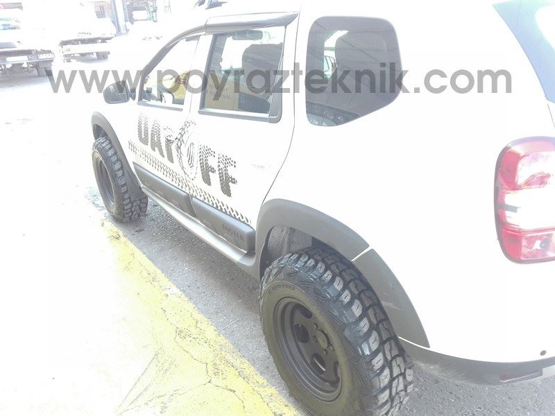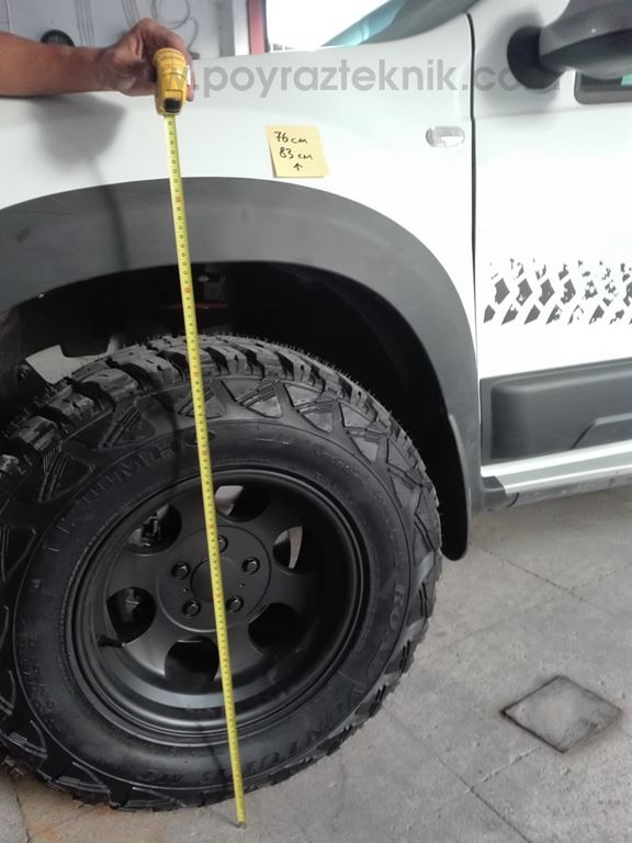 235×75 ebatlarında Off Road MT lastik, ofsetli jant, 4 cm yükseltme, dodik, alt koruma ve benzeri uygulamalar.